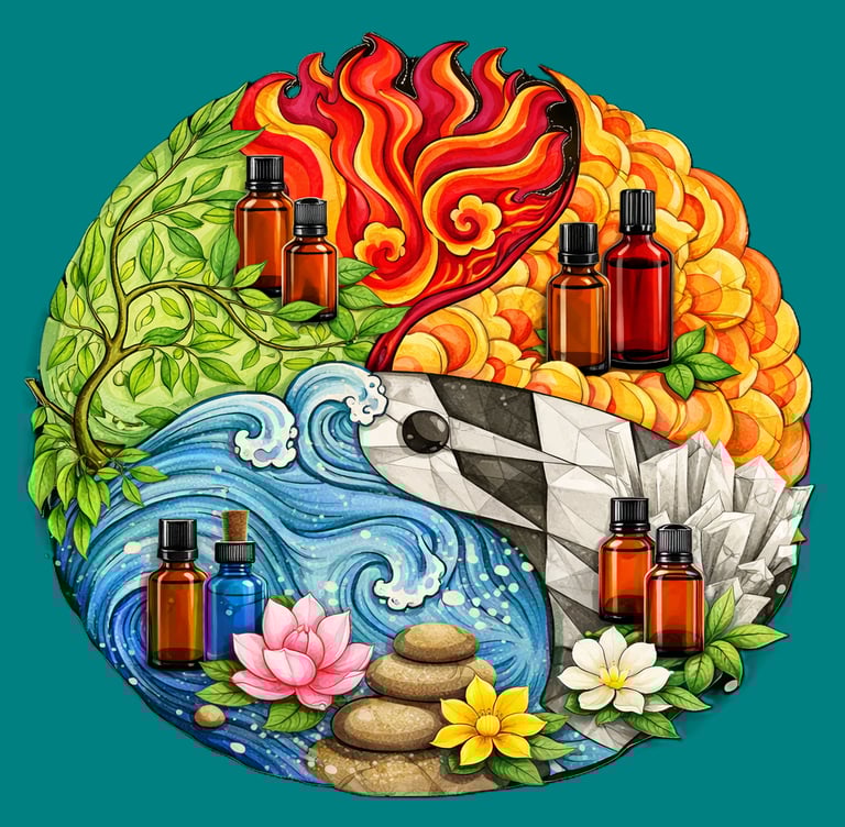 When applied through aromatherapy, essential oils become bridges between the elements, helping us restore equilibrium. A cooling Yin oil might soothe excess Fire, while a warming Yang oil may strengthen Water or Earth. In this way, aromatherapy becomes a living practice of the Five Elements — harmonizing body, mind, and space.